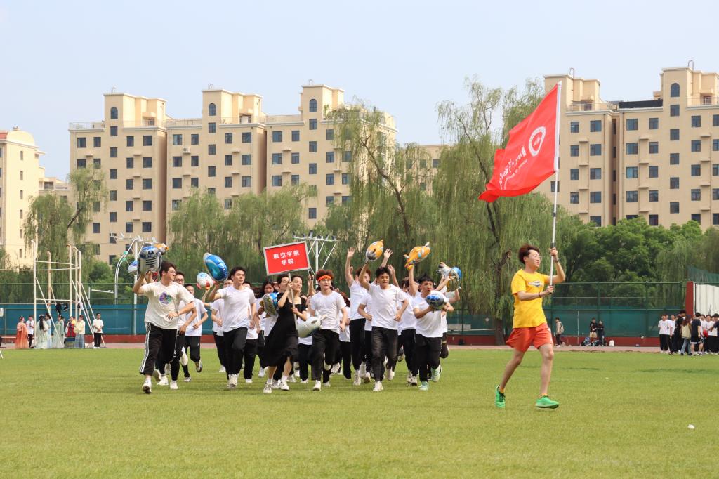方阵的同学们身穿白色衬衫,手上拿着火箭气球,活力四射,在进场时,更有飞机模型冲上蓝天,彩带飘扬,为学院增光添彩,展示我院独有的风景。