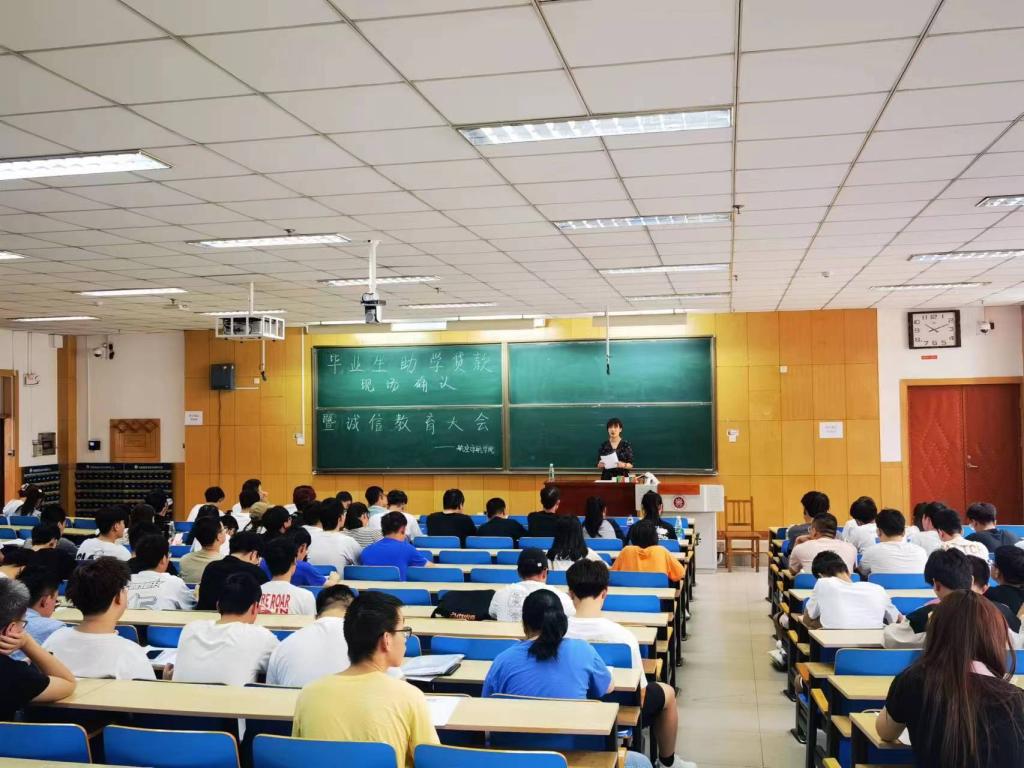 于11109H教室举办了2019届开行生源地贷款学生毕业现场确认暨资助诚信主题教育活动,活动由我院资助辅导员段雪倩主持,2019级申请生源地贷款的毕业生参加了活动。
