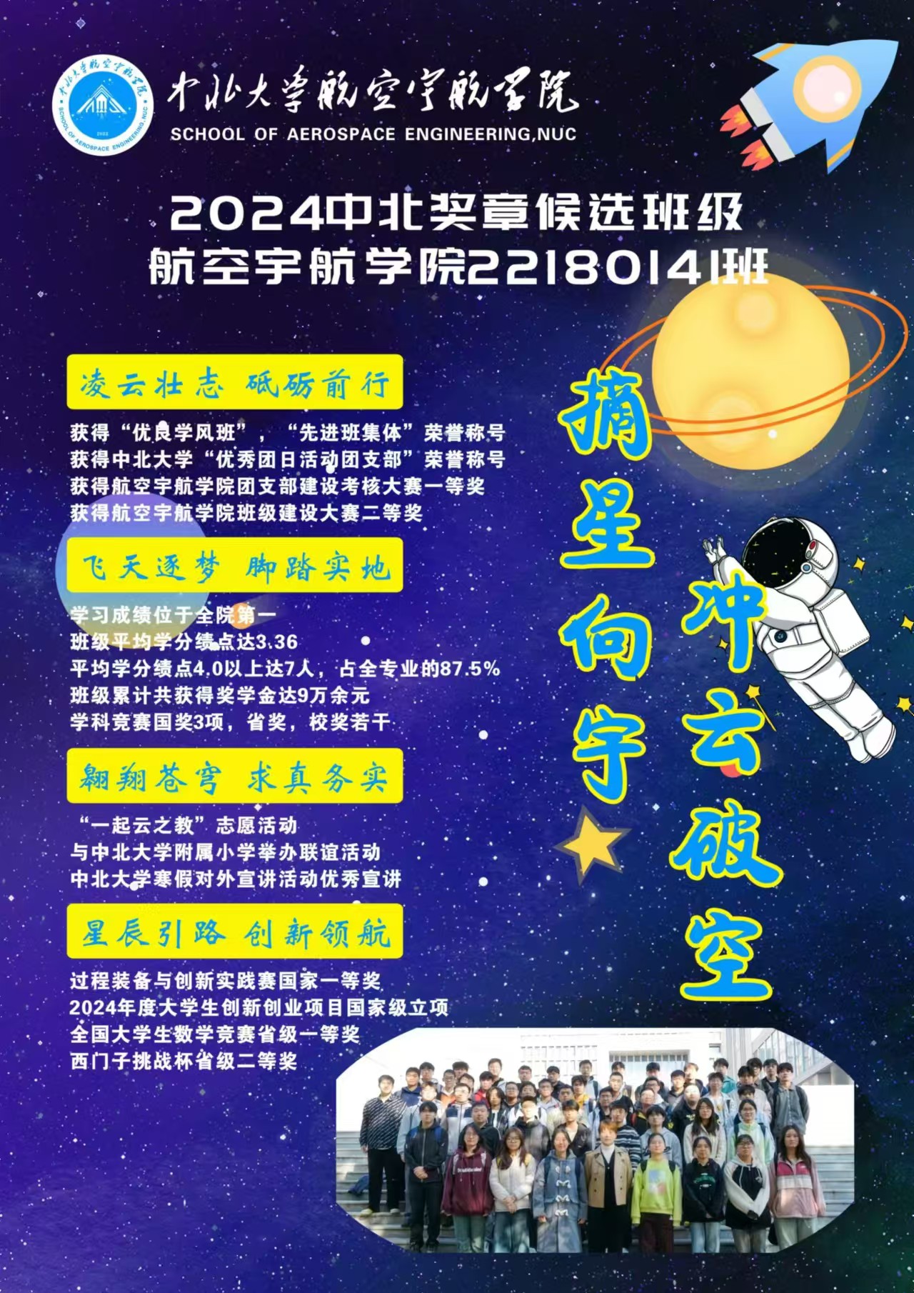 摘星向宇,冲云破空班级介绍:50名志同道合同学,相遇在中北,组成了22180141班。我们在段雪倩老师的引领下,共同学习,共同成长。班级学风优良,同学勤奋好学,积极进取,成绩优异。班级同学优秀率高达52%,学分绩点超过4.0的同学有7人,占专业的87.5%。在各项学科竞赛中屡获佳绩,展现出航空宇航学子的拼搏精神。我们团结友爱,互帮互助,积极参与各类公益活动,用实际行动传递爱心,践行社会责任。我们班级文化氛围浓厚,定期...